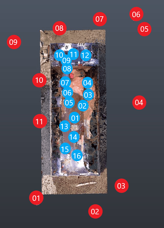 In July, 2019 the interior of the structure was captured using a Leica BLK 360 scanner using 16 scanning locations in a zig-zag pattern (blue dots). No targets were used to capture the interior of the building, and scans were registered together using cloud-to-cloud registration in AutoDesk ReCap Mobile and Pro.